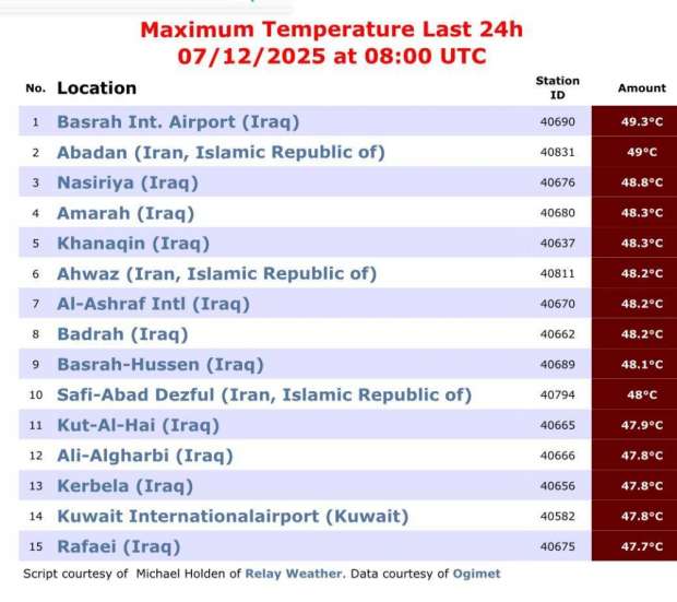 وأظهر الجدول أن منطقة مطار البصرة الدولي في العراق سجلت أعلى درجة حرارة في العالم 49.3 درجة مئوية، تليها في المرتبة الثانية «عبادان» في إيران 49 درجة مئوية، وفي المرتبة الثالثة مدينة الناصرية في العراق 48.8 درجة مئوية، وجاءت مدينة العمارة العراقية رابعاً بـ48.3 درجة مئوية، و«خانقين» في العراق خامساً بدرجة حرارة بلغت 48.3 درجة مئوية.