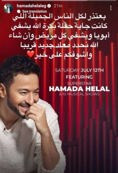 ونشر حمادة هلال، البوستر الرسمي للحفلة، على خاصية ستوري على حسابه الشخصي بمنصة «إنستغرام»، كاشفاً أن سبب الاعتذار تعرّض والده لوعكة صحية طارئة استدعت وجوده بجانبه.